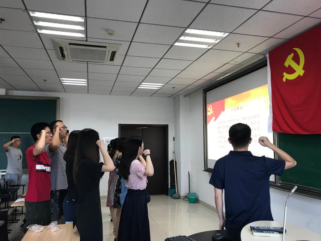 大会在雄壮的《国际歌》中拉开序幕,16名新党员面向鲜红的党旗,庄严地表达了自己的信仰,向党组织郑重宣誓,愿为共产主义奋斗终身。随后,2016级本科生方栋代表新党员作了发言,他汇报了自己一年多来的学习体会,坚信只有中国共产党的领导,才能带领中国人民实现中华民族伟大复兴的中国梦,表示今后要树立远大理想、练就过硬本领、担当时代责任、从严要求自己,积极发挥党员的先锋模范作用,无愧于共产党员的光荣称号。