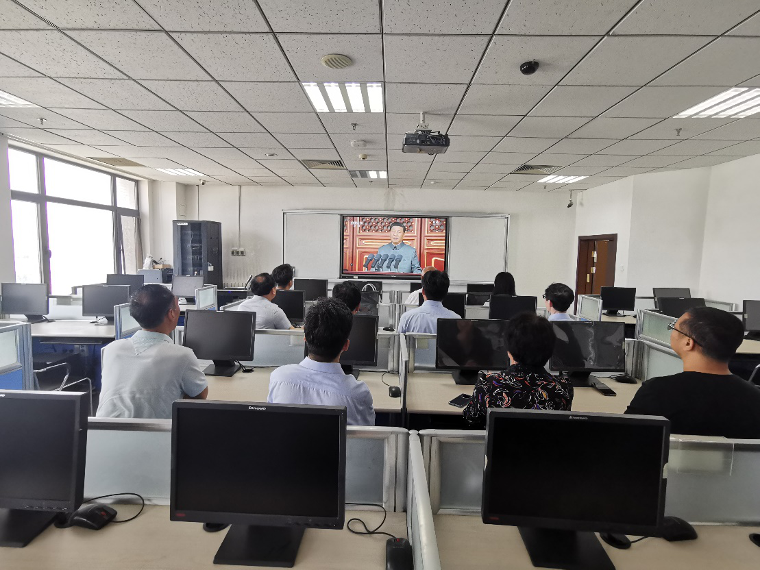 大会伊始,当看到直升机悬挂着鲜红的党旗、以及标语“伟大的中国共产党万岁”、“伟大的中国人民万岁”、“伟大的中华人民共和国万岁”、“全国各族人民大团结万岁”飞过天安门上空时,党员老师们不禁热泪盈眶、热血沸腾。之后在庄严的升国旗仪式上,全体党员起立,跟随冉冉升起的五星红旗唱响了国歌。当听到共青团员和少先队员代表献词中说到“请党放心,强国有我”时,党员老师们在心中也跟着默念“请党放心,强国有我”,虽然很多党员老师已不再年轻,但是心中执念依旧—为强国贡献毕生精力。最后,党员老师们认真听取了习近平总书记的重要讲话。