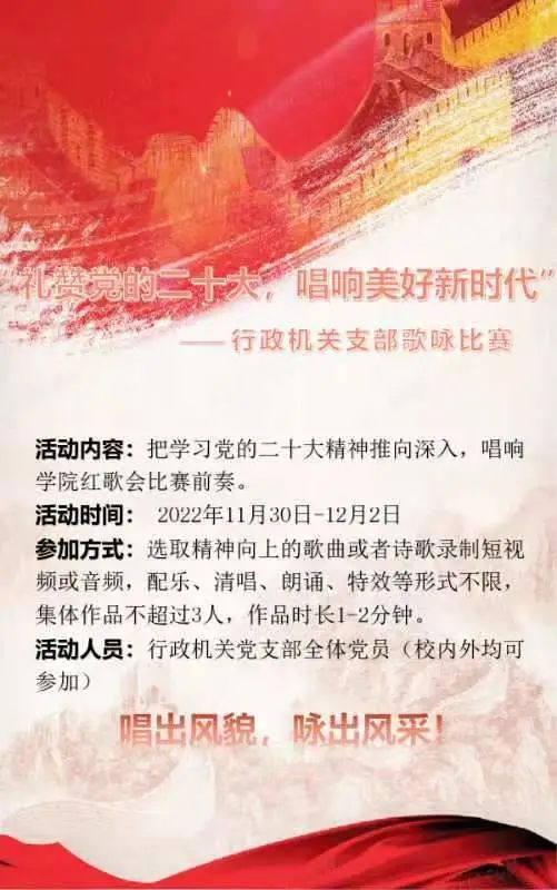 为将学习党的二十大精神推深推实,推动支部建设高质量发展,11月30日至12月2日,2026世界杯官网行政机关党支部举办了以“礼赞党的二十大,唱响美好新时代”为主题的歌咏比赛,此次比赛结合疫情防控实际,采取了线上录制短视频的方式,通过歌唱、朗读积极向上的歌曲与诗歌,为时代礼赞,用歌声的力量感染着每位老师。