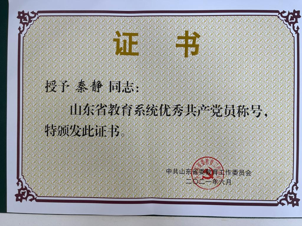 近日,时值伟大的中国共产党诞辰100周年之际,中共山东省委教育工委下发了《中共山东省委教育工委关于表彰山东省教育系统优秀共产党员、优秀教育工作者和先进基层党组织的决定》,世界杯官网教师党员秦静获评山东省教育系统优秀共产党员。