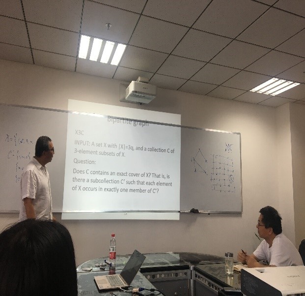 访问期间,PING WANG教授分别进行了题为“Fire Control (networks virus control) (2学时)”、“Firefighting problem and its related computation problems (2学时)”、“Fire on planar graph (2学时)”、“Using Bipartite networks to construct personal recommendation system (2学时)”、“Strong chromatic index of K4-minor free graphs (2学时)”、“Some open problems (2学时)”、“Firefighting problem in graph theory (3学时)”、“Community discovery in social networks (3学时)”的前沿学术讲座。