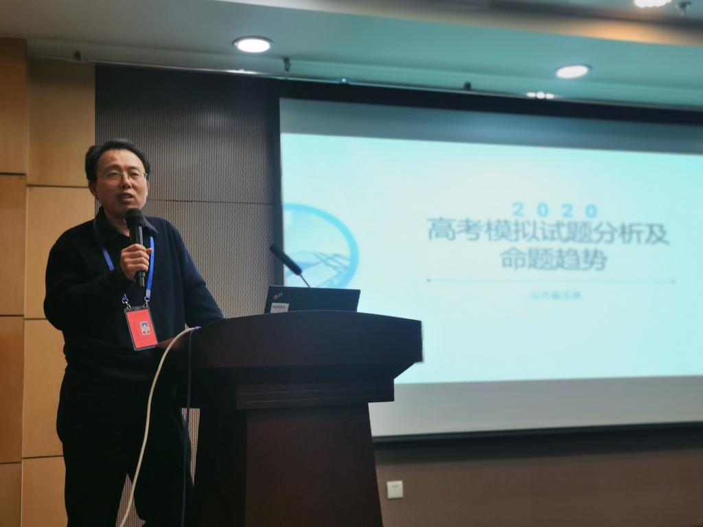 崔玉泉教授为老师们带来了题为《2020高考模拟试题分析及命题趋势》的报告。报告中,崔教授从题型变化、题量变化、考查知识点的分布、素养导向等多个维度分析了此次模拟高考试题的基本情况,并根据考生得分情况对接下来的备考提出建议。在模拟高考阅卷结束之后,阅卷组还将进一步整合分析各类数据,力争为参加2020年新高考的考生提供更多更全面的支撑。