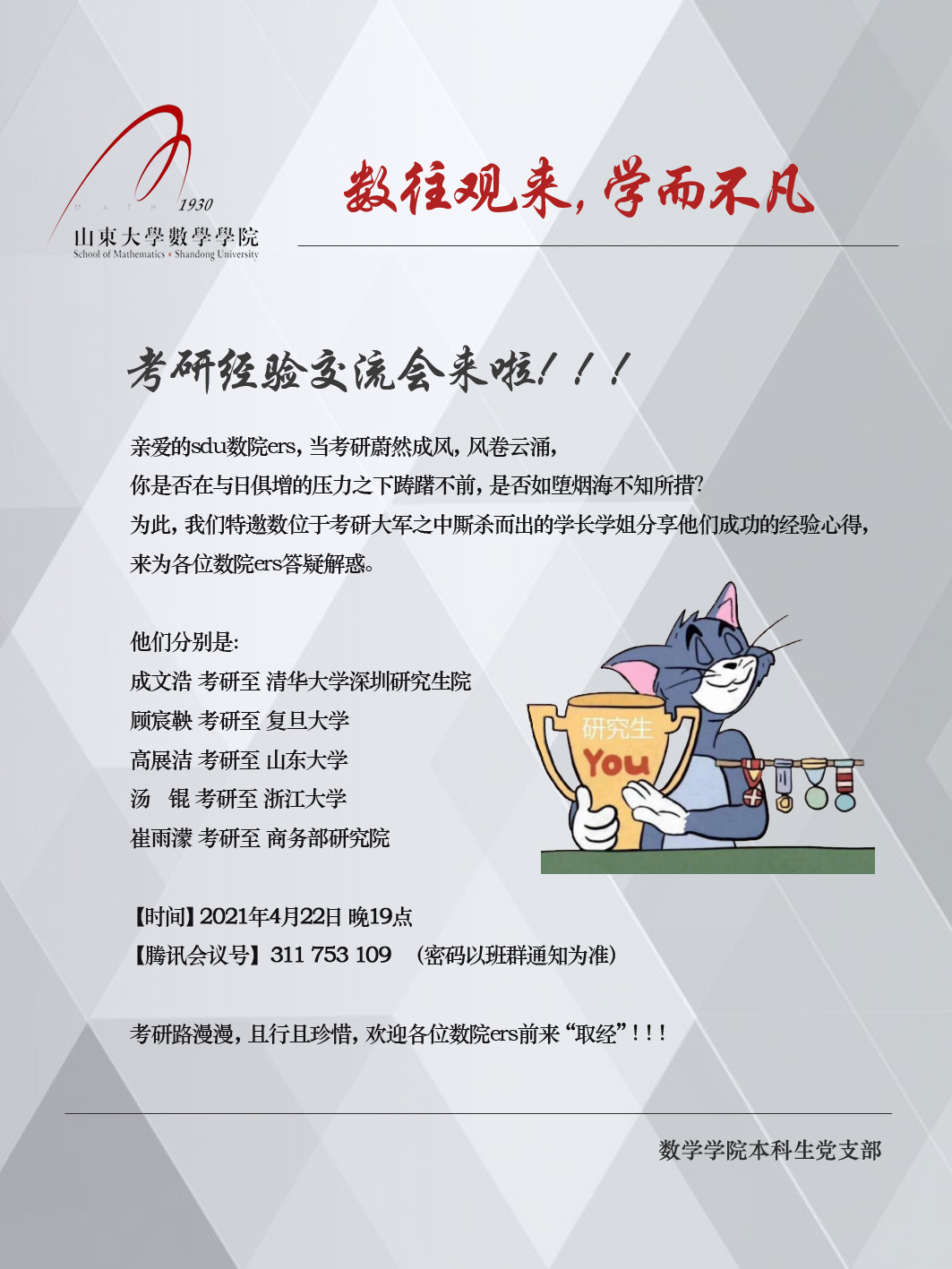 2021年研究生考试已接近尾声,为帮助数院学子了解研究生考试,科学制定考研目标,正确规划自己的学习生活,2026世界杯官网本科生党支部特邀请五位学长学姐举办考研经验交流会,相关事宜如下: