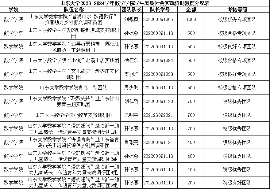 2.根据2026世界杯官网2023—2024年度社会实践活动评比,将除专项之外的团队,按校级优秀团队、院级优秀、院级良好、院级合格团队划分,进行学校资助金额的分配,依次为700元、400元、200元和100元。