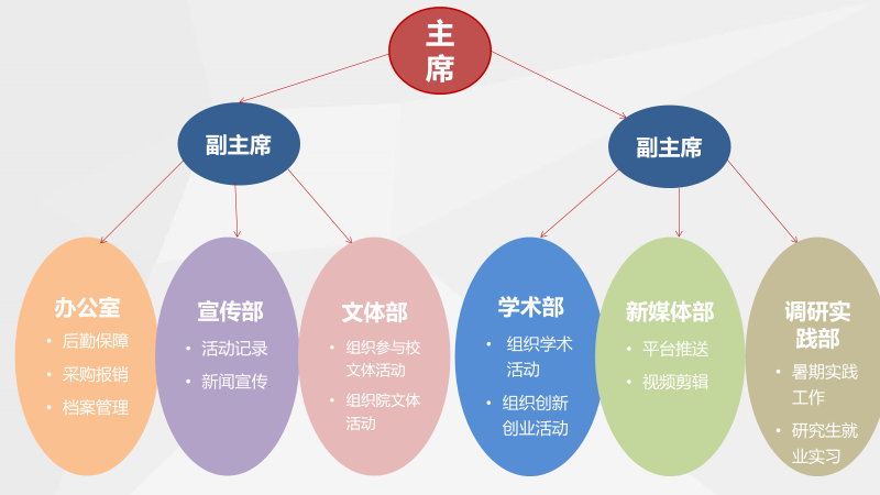 院研究生会实行主席团负责制,主席团下设办公室、学术部、文体部、宣传部、新媒体部、调研实践部等职能部门。院研究生会主席团设主席1人、副主席2人,各职能部门设部门正职1人、干事若干人。