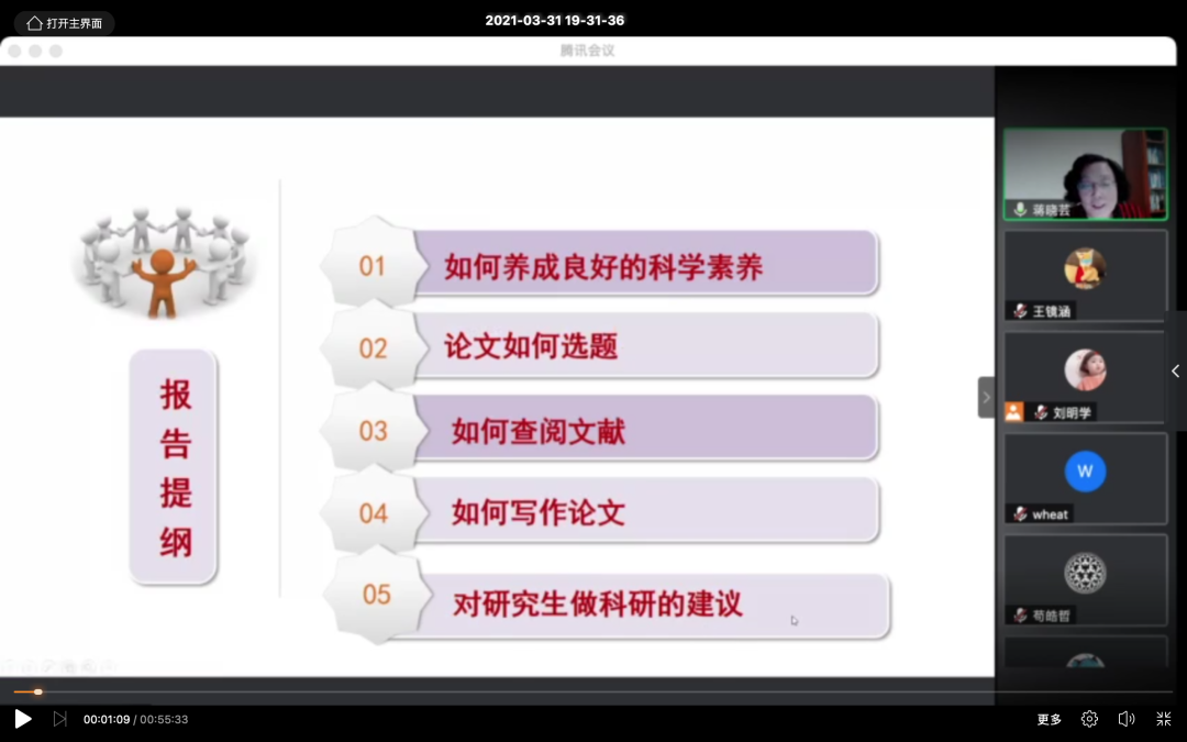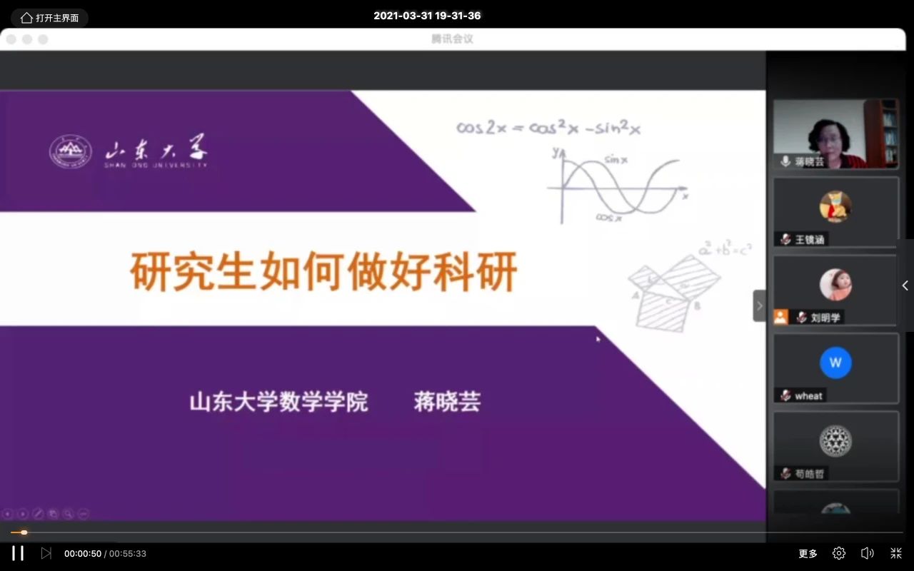 蒋晓芸强调,研究生应该培养一定的科研素养,要对科学保持好奇心和求知欲,善于学习新知识;要打下扎实的学科基础知识,对生活、自然有自己的洞察力和想象力;要深层次地、带批判性地思考问题,善于提出新问题,并设计方法去解决;要有较强的自主学习能力,有责任感。蒋晓芸还强调了查阅文献的重要性,同学们要学会借助学校图书馆网站查询电子和馆藏纸质文献,广泛地收集与研究课题相关的信息和知识,寻找课题的突破口。最后,蒋晓芸强调,做科研应以德为先,坚守学术道德,坐得住冷板凳,为数学学科的发展做出自己的贡献。