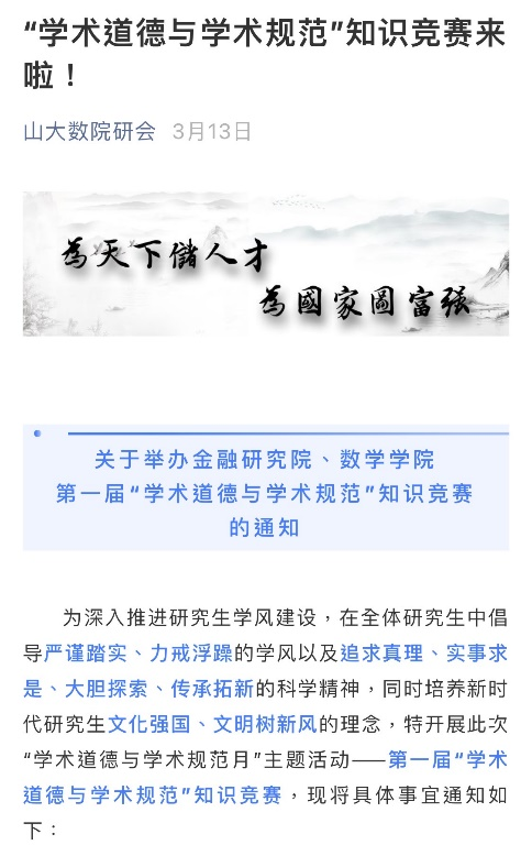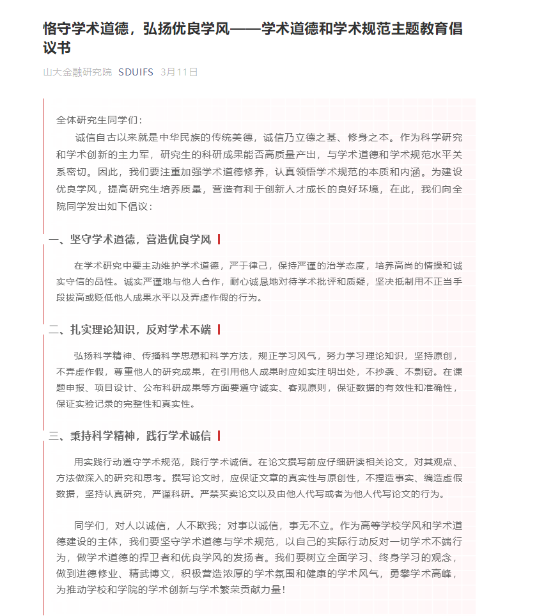 3月11日,学院于线上公众平台发布了学术道德规范倡议书,从坚守学术道德、反对学术不端、营造优良学风三方面深刻阐明了恪守学术道德、弘扬优良学风的重要意义和现实价值,全体研究生在倡议书上签名,在一言一行中扩散恪守学术道德和学术规范的正能量。