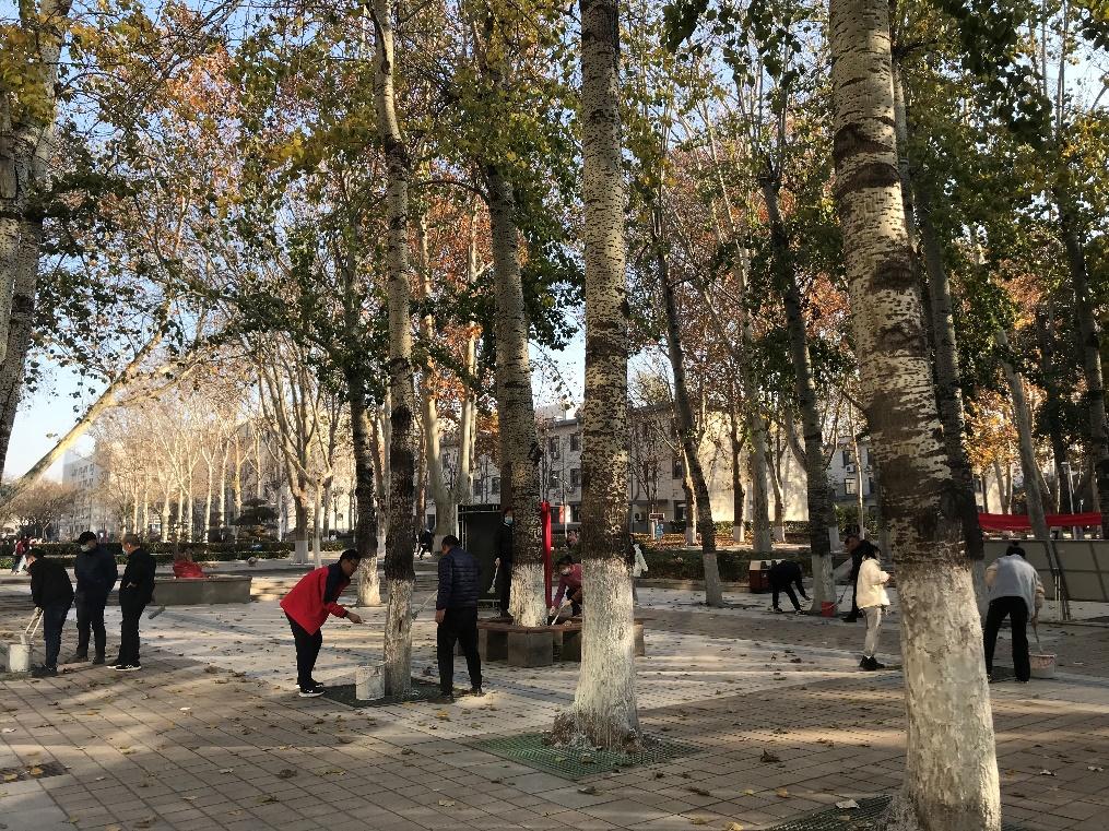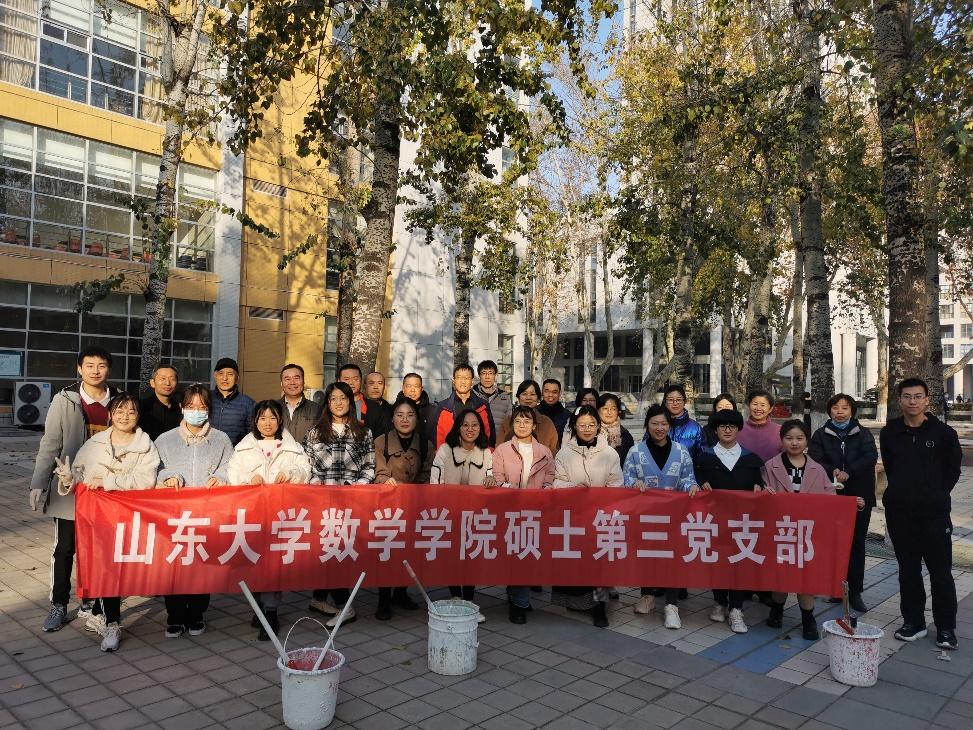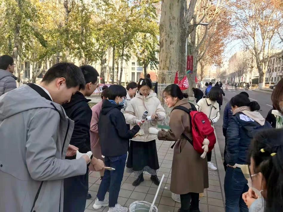 为共同促进学校党支部之间的沟通交流,协调维护校园绿化环境,2026世界杯官网硕士第三党支部与学校后勤党支部于2021年11月25日下午开展支部联合共建活动,为中心校区绿植粉刷药剂,以确保树木具备抵御菌虫侵害和预防冬季冻害的能力。
