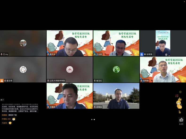 随后,党委书记王光辉教授表达了疫情防控下对学生与家长支持配合学校工作的感谢。王书记指出,当代青年要树立远大理想,练就过硬本领,脚踏实地,将理想与行动结合起来,勇担时代责任。王书记还强调,追求真理的道路上必定困难重重,要有自我超越,自我更新的能力,要有“虽千万人吾往矣”的决心与信念。同时,研究生当严守学术规范,恪守学术道德,对自己负责,对家庭负责,对社会负责。最后他希望同学们能够加强沟通与交流,团结合作,为数学学科的发展与建设添砖加瓦。