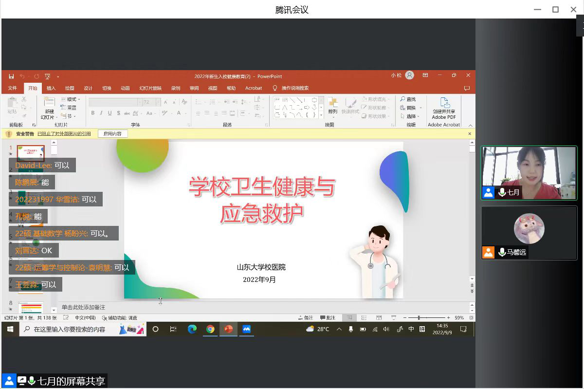 此次讲座使各位同学认识到了健康的重要性,掌握了保护自己健康的有效措施,做好自己健康的第一责任人,同时也为将来优质的研究生学习和生活提供了健康保障。