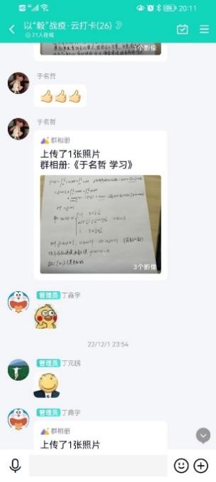 历时6周的“以毅战疫”云打卡抗疫情活动圆满落幕,本次活动自开展以来广受数院学子欢迎,丰富多样的打卡活动吸引了来自不同年级、不同专业的同学们积极参与。本次打卡涉及背单词、运动锻炼、专业学习、读书分享、美食光盘以及书法等方面,大家选择自己的专属打卡计划并上传至群相册,记录了疫情下数院研究生生活的N种打开方式。通过此次打卡活动,充分调动了同学们的积极性,与云伙伴一起完成打卡日记,帮助同学们减轻因疫情带来的心理压力。以打卡促自律,以学习促提升,愿大家在接下来的日子里依然能坚持好习惯,并将这种坚持不懈的精神投入到学习与生活中。