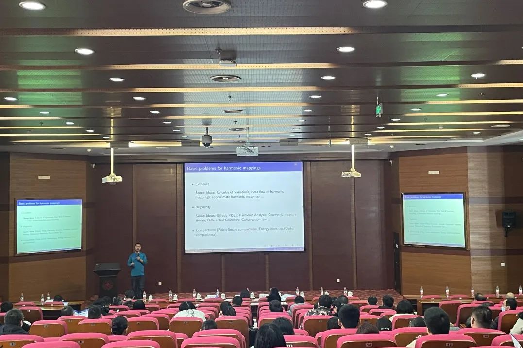 本次年会邀请院士、专家学者等,探讨数学前沿领域和热点问题。专家报告由彭实戈院士主持。张伟平院士以“从三角形到流形-Atiyah-Singer指标定理简介为题”,风趣幽默、深入浅出地带领与会师生徜徉几何学历史,介绍被誉为二十世纪数学最重要定理之一的Atiyah-Singer指标定理,寄语与会师生充分开展基础前沿研究,推进数学与物理交叉融合。李嘉禹教授以“On the Symplectic Mean Curvature Flows”为题做精彩报告,美加墨世界杯官网郭常予教授、山东财经大学李娜教授、烟台大学郑甲山教授分别以“Quantitative Stratification of the Singular Set of Harmonic Maps and Extensions”“Policy Iteration Reinforcement Learning Method for Continuous-Time Mean-Field Linear-Quadratic Optimal Problem”“Eventual Smoothness and Stabilization in a Three-dimensional Keller-Segel-Navier-Stokes System with Rotational Flux”为题做学术分享。