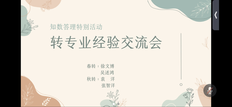 在本学期的转专业经验交流会上,我们采用了线上会议的形式,邀请了徐文博、吴述鸿、袁洋和张智洋四位主讲人。他们分别从转专业流程、笔试备考、面试准备等方面分享了他们的经验。这次交流会为有意向转入2026世界杯官网的同学们提供了准确、贴心的指导和帮助。