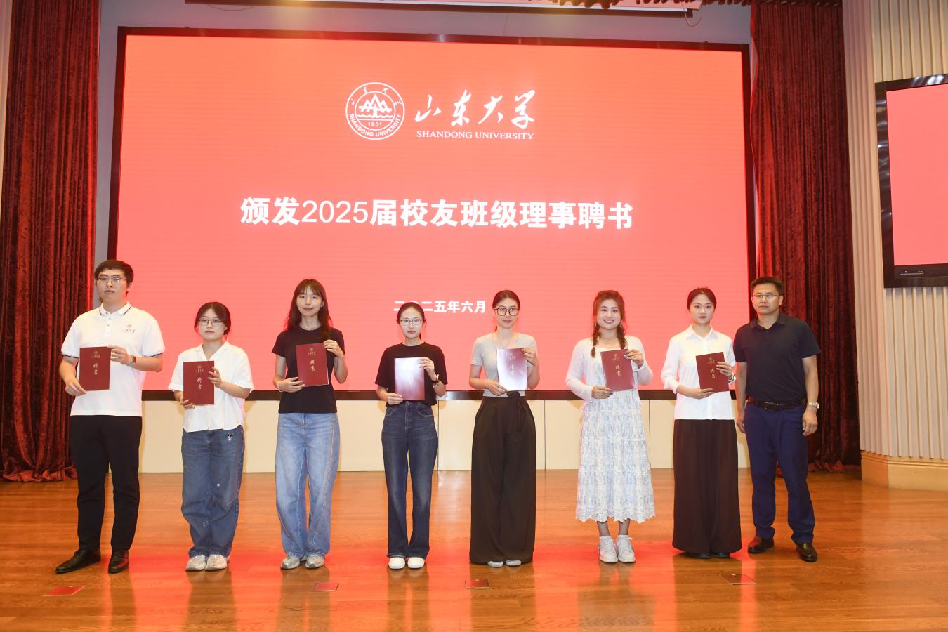 庄严的中华人民共和国国歌《义勇军进行曲》拉开了毕业典礼的帷幕。在典礼上,陈增敬宣读《关于表彰2025年“数学新星”的决定》并为他们颁发“数学新星”奖杯。王光辉为校友班级理事代表颁发聘书。